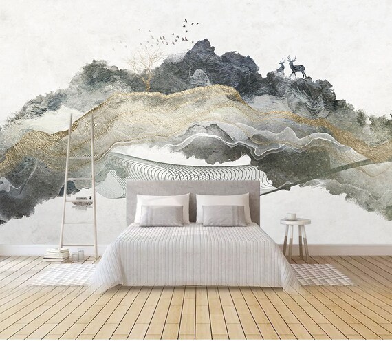 Abstract Chinese Ink Brush Style Background Gold Foil Tree Etsy